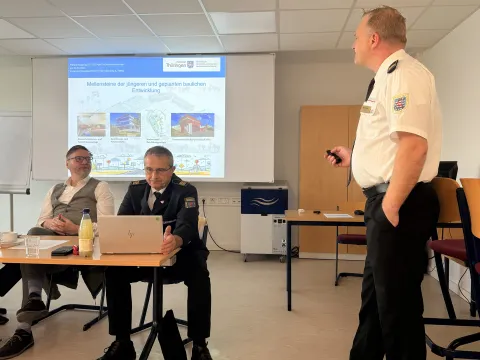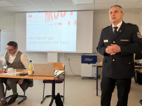 Jörg Henze, Schulleiter der Thüringer Landesfeuerwehr- und Katastrophenschutzschule und Marc Stielow aus dem Thüringer Ministerium für Inneres, Kommunales und Landesentwicklung (TMIKL) stellten den aktuellen Entwicklungsstand der TLFKS 2.0 vor und gaben spannende Einblicke in die zukünftige Entwicklung der Ausbildung. Dirk Behnisch, Leiter der Abteilung 5 des TMIKL gab einen Überblick zu Neuerungen und aktuellen Themen aus dem Ministerium.